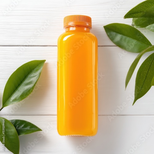 Orange juice bottle, fresh leaves