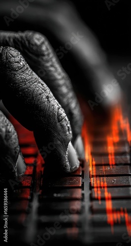 Close-up, aged hands typing on keyboard, orange/red overlay