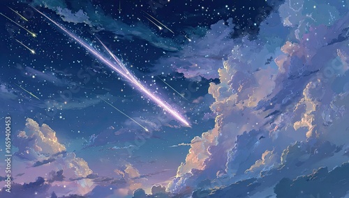 Starry night sky, vibrant clouds, shooting star