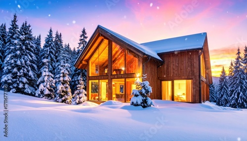 Snowy chalet at winter sunset