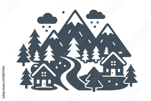 Winter vacation iconographic design. Snowy mountain village with cabins, pine forest, and road. Vector landscape for Christmas holiday travel. Alpine nature scene illustration.