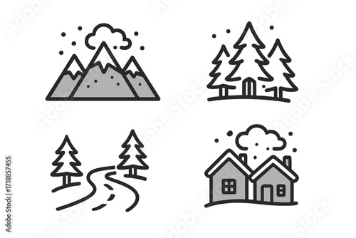 Winter vacation iconographic design. Set of vector line icons. Mountain landscape, snowy village, pine forest, house, road. Symbol for travel, ski resort, nature, holiday.