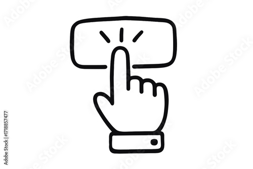Hand clicking on button. Hand drawn doodle icon. Vector illustration for internet marketplace. Click here symbol. Online shopping, e-commerce, call to action concept. Buy now.