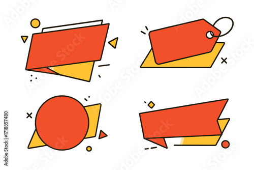Set of sale discount banners and tags. Modern trendy geometric design in red and yellow. Vector abstract price labels, stickers, and ribbon shapes for special offer promotion.