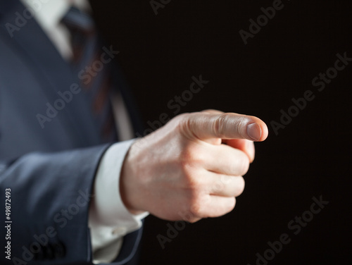 Creative collage of big arms fingers point mini black white colors girl blame accuse isolated on beige background