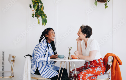 Coffee, the official drink of girls night in. two young women having coffee and chatting on the sofa at home.