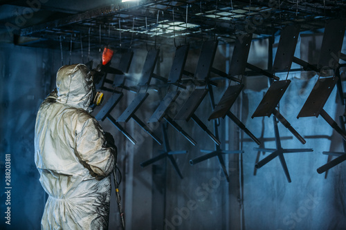 Powder coating of metal parts. A woman in a protective suit sprays powder paint from a gun on metal products