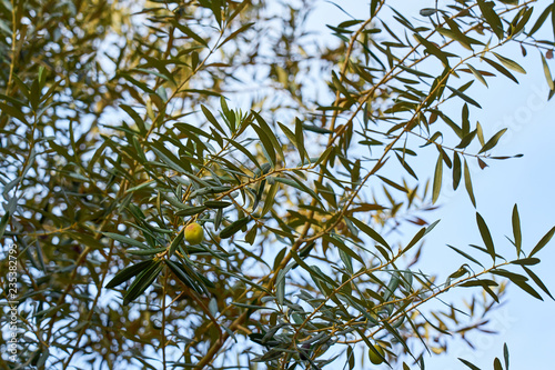 A green olive on branch of olive tree on a sunlight against a blue sky.