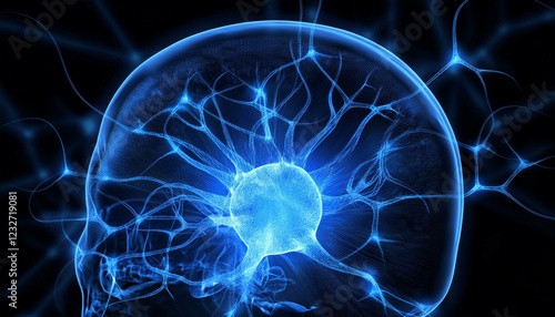 과적된 정보의 신경망 폭주, 두개골 안에서 푸른색 신경세포들이 과열된 CPU처럼 깜빡이며 과도하게 연결되는 모습