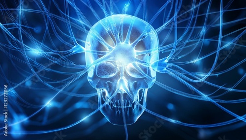 과적된 정보의 신경망 폭주, 두개골 안에서 푸른색 신경세포들이 과열된 CPU처럼 깜빡이며 과도하게 연결되는 모습