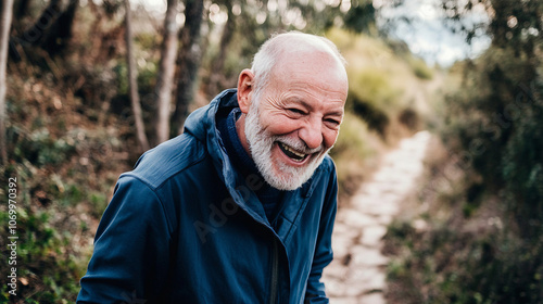 산길을 걸으며 활짝 웃는 노년 남성, AI 생성