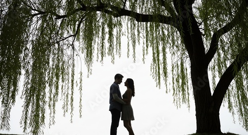 柳の木陰 優しく抱き合う恋人シルエット 柔らかな光 静かな公園. AI Generated