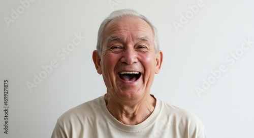 笑顔輝く高齢男性 穏やか光で撮影 幸せな表情. AI Generated