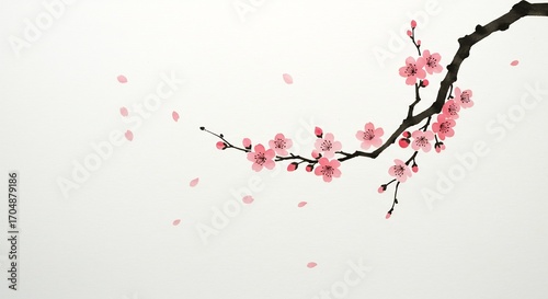 優美な桜の枝 淡いピンクの花びら舞い散る 水墨画風背景. AI Generated