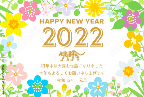 寅アイコンと春の草花フレーム 横レイアウト - 2022年 寅年 年賀状テンプレート 添書き付き