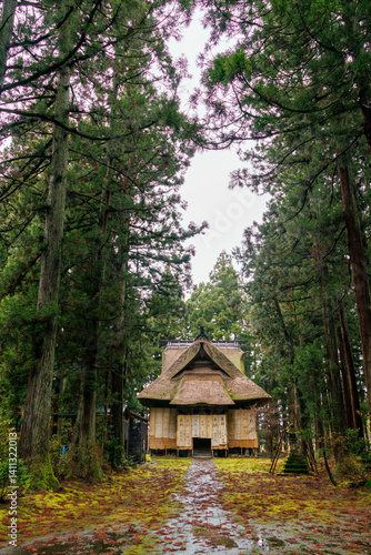 杉林の中にある立派な本堂。 雪から木材を守る藁や布製の雪覆いで覆われている。 その上には寄進者のサインも書かれていた。 神秘的で美しい神宮寺。 茅葺き屋根の本堂と緑が美しい苔むした境内と杉の大木林が印象的。 冬季に訪れたので、豪雪対策の雪囲いが施されている。 新潟県十日町市 - 2024年12月1日