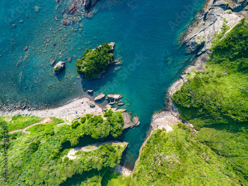 許可を得て、中木港とヒリゾ浜、大根島、あいあい岬、ユウスゲ公園などをドローンで空中撮影をしている。 渡船でしか渡れないビーチである。 静岡県伊豆半島賀茂郡南伊豆町中木ヒリゾ浜-2025年