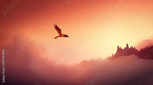 A bird flies over a castle on a foggy hill