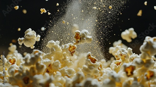 A black background showcases a burst of popcorn, sprinkled evenly by a spray