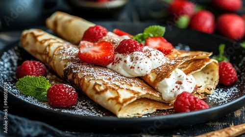 A black plate with crepe-covered raspberry mint dessert