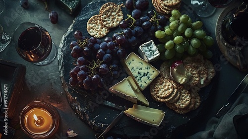 A cheese board with crackers, grapes, and wine next to a candle