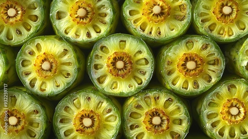 A close-up image of a kiwi fruit cut in half to reveal its fruit segments