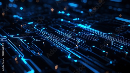A close-up of a computer circuit board with blue and white lines on its surface