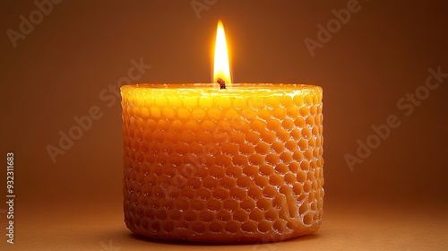 A close-up of a lit candle on a brown background with a small amount of light coming from the top