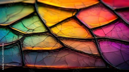 A close-up photo of a colorful stained glass window displaying a leafy pattern on its exterior
