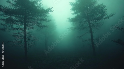 A dense forest shrouded in mist, featuring numerous trees in the foreground and a bench positioned centrally within the woodland