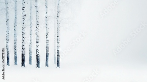 A forest of trees on a snow-covered field with a hazy sky background