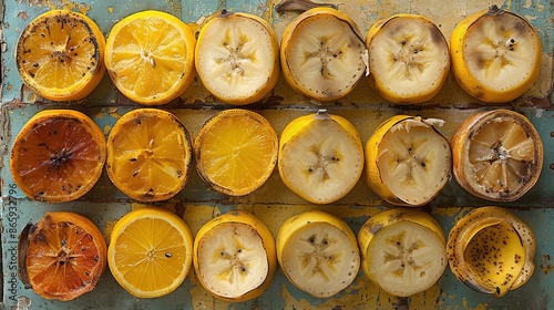 A group of orange slices resting on a blue table alongside other oranges stacked on top of one another