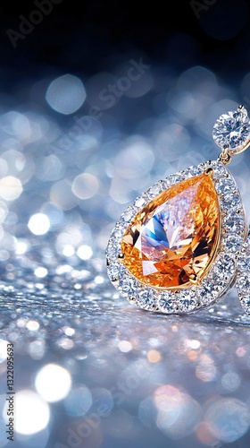A macro shot of a glittering ring featuring an orange and white diamond at its center, resting on a reflective surface