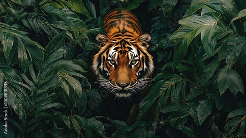 A majestic tiger standing amidst lush green foliage, gazing directly into the camera's lens