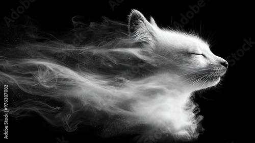 A monochrome image of a feline's face with smoke emanating from its rear end