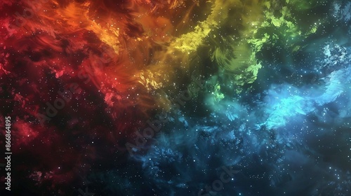 A multi-colored sky filled with stars and a rainbow; a rainbow-colored star is at the center of the image