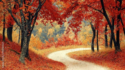 A painting depicts a road enveloped by trees displaying red leaves on the ground and an array of yellow and orange foliage