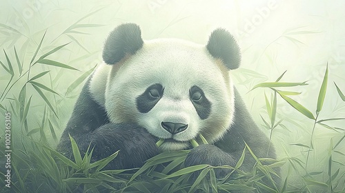 A panda bear resting amidst tall grass with eyes shut and bamboo in mouth