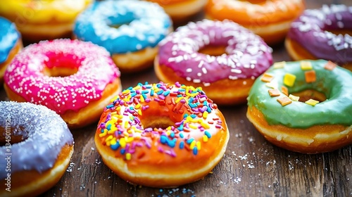 A photo featuring several doughnuts in close-up, adorned with sprinkles on their summits