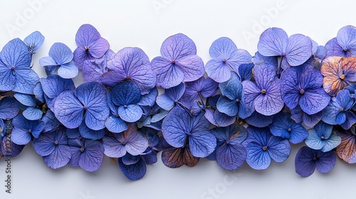 A picture of several purple blossoms against a white background, framed by a blue border above