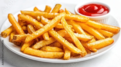 A plate of French fries with ketchup on a white plate on a white table is a classic dish enjoyed by many people