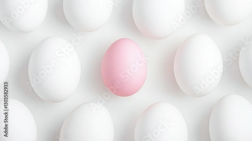 A row of white eggs, including one pink egg, arranged on a white surface