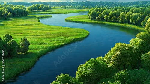 A serene depiction of a river flowing through verdant meadows, surrounded by lush foliage