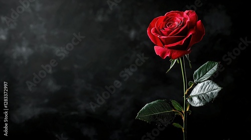 A solitary red rose featuring emerald foliage against a black backdrop, with a radiant light emanating from the flower's core
