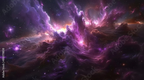 A space image featuring purple-hued clouds and stars scattered across a purplish night sky