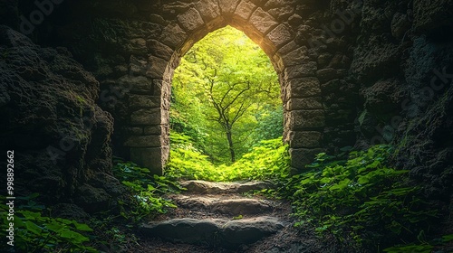 A stone wall tunnel with a bright light at its end leads to a lush green forest