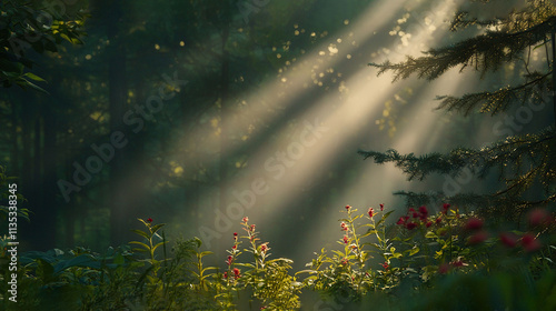 A sunbeam illuminates a forest of wildflowers and scattered red blossoms