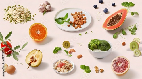 A table topped with fruits and vegetables, a bowl of nuts, and a plate of broccoli and an orange