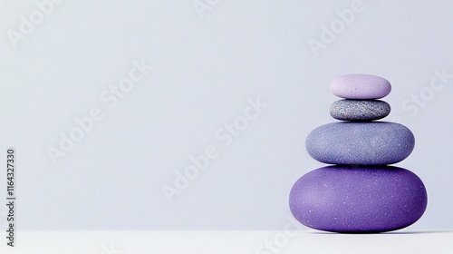 A tower of stones resting atop a white table, adjacent to a blue backdrop