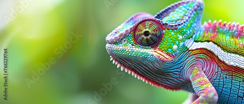 a vibrant chameleon perched on a tree branch, with a sharp focus and no blur